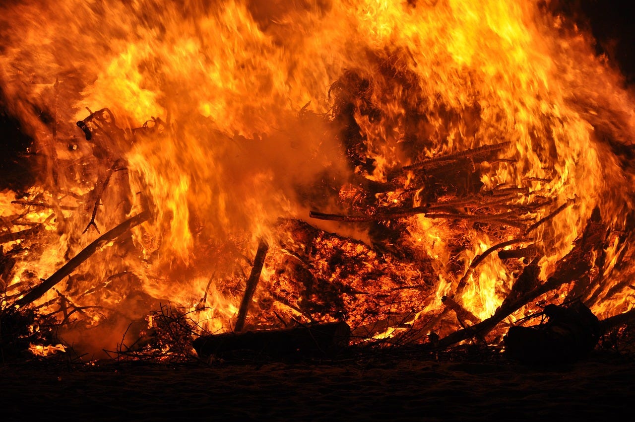 Culture has always built fires to gather around, to concentrate energy, to give dangerous forces a place. But fires are also lit to be seen. Light on the wallpaper, people at the windows. When attention itself becomes the object, the blaze spreads without a center that can hold it, without a victim who can remain hidden. The hillside burns, the crowd gathers, and afterward we look for someone to blame. There is no one.