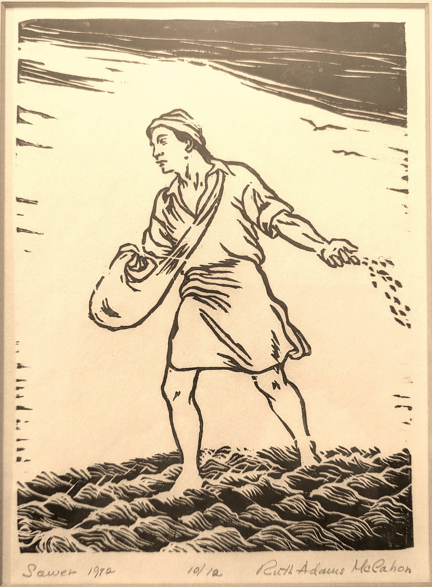 On considering the role of God’s grace in the context of having and living with composite models, my ongoing theme, the Parable of the Sower came to mind. It helps that my grandmother, a professional artist in her day, carved and printed a piece she titled The Sower, though I don’t know if she meant just an agrarian image or something calling towards the aforementioned parable. The Parable of the Sower is not merely about belief and unbelief. It is about the configuration of desire, about the kind of composite model that either resists or receives grace.